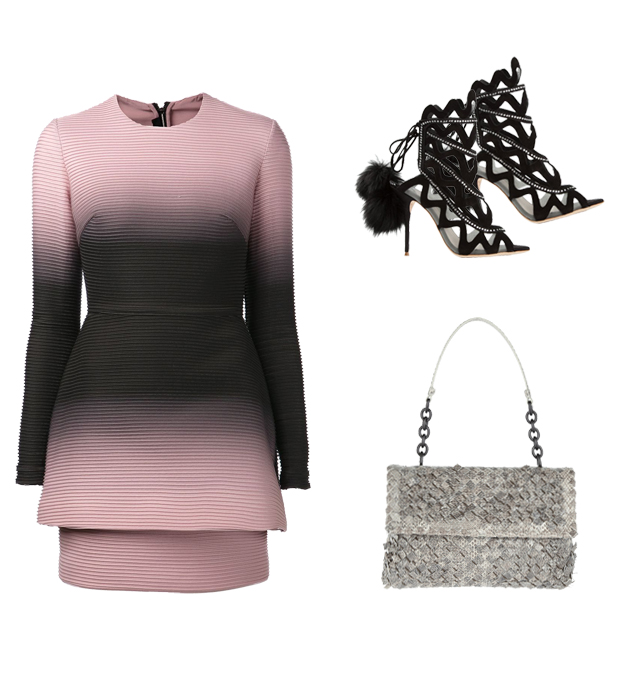 Elie Saab 渐变色长袖连衣迷你裙/ Sophia Webster 毛绒装饰高跟凉鞋/ Bottega Veneta编织工艺艾尔斯蛇皮单肩包。