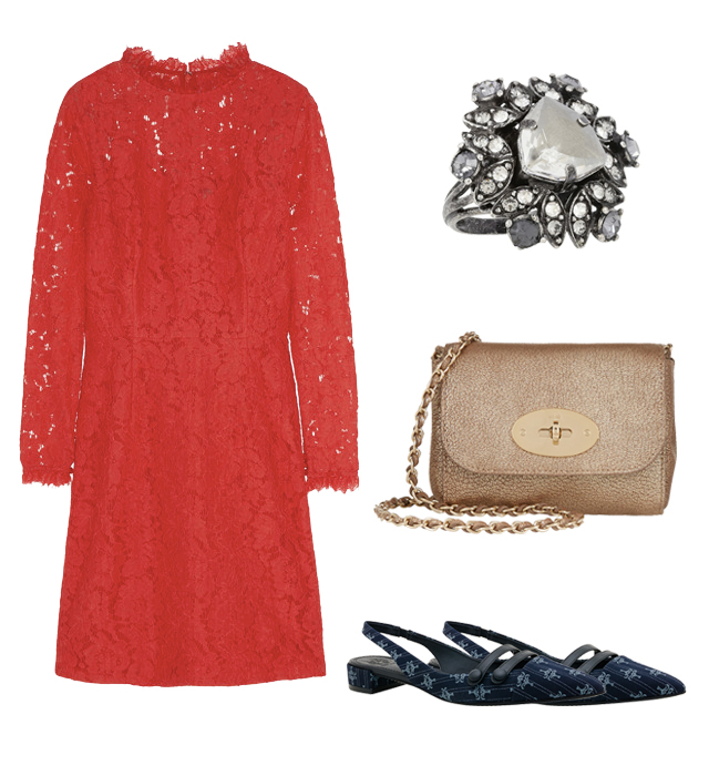 Temperley London Coco 棉质混纺蕾丝连衣裙/ Lanvin 水晶炮铜色戒指/ Mulberry 金色单肩包/ Tory Burch 纹饰牛仔布平底鞋