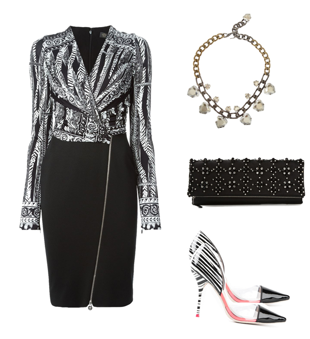 Versace 巴洛克印花拼接连衣裙/ Lanvin 银色和金色水晶项链/ Giorgio Armani 珠饰手拿包/ Sophia Webster 尖头高跟鞋。
