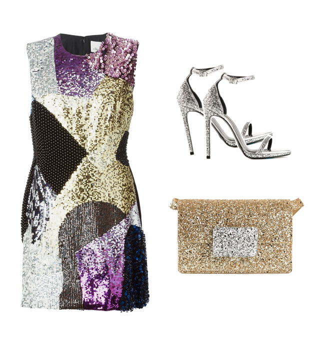 3.1 Phillip Pim 亮片无袖连衣裙/ Saint Laurent 银色亮片高跟凉鞋/ Saint Laurent 亮片手拿包。