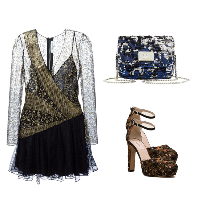 Blumarine 半透明蕾丝连衣裙/ Jimmy Choo 亮片链条单肩包/ Valentino 羽毛饰高跟鞋。