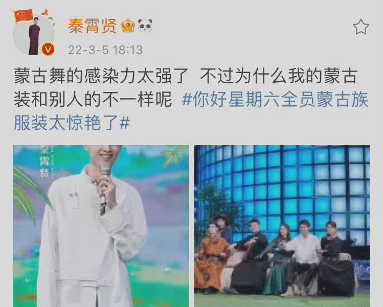 #秦霄贤说蒙古舞的感染力太强了#老秦的蒙古服装好好看,坐等今晚《你好星期六》一起看蒙古舞吧[心]