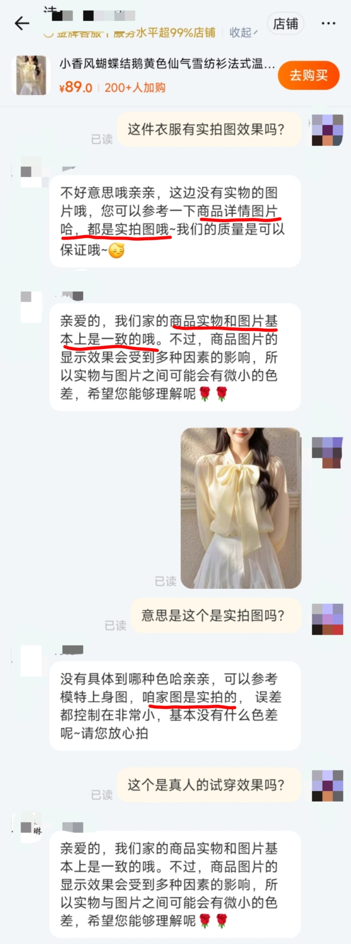 客服会不断强调衣服是“实拍图”,但是避免直接回答“上身图是否是实拍”的问题。