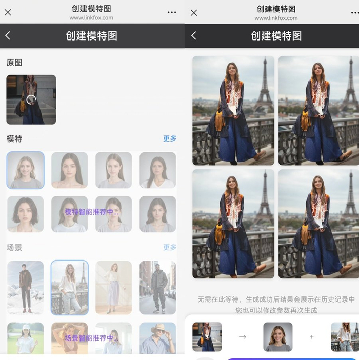 在提供商品图、选择平台上的模特和场景后,LinkFox AI即可生成新的服装宣传图。