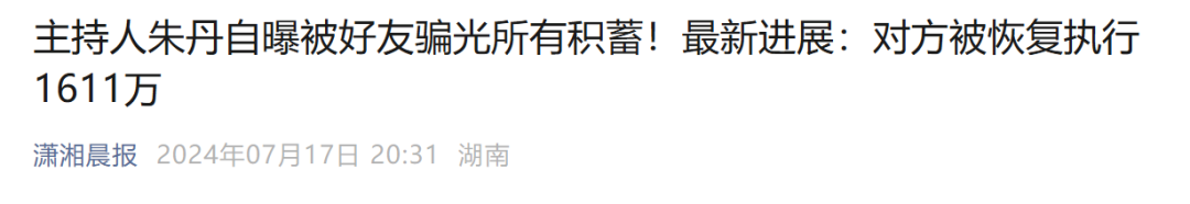 据潇湘晨报2024年7月报道,知名主持人朱丹在节目中自曝被好友骗光积蓄,该事件传来最新进展。