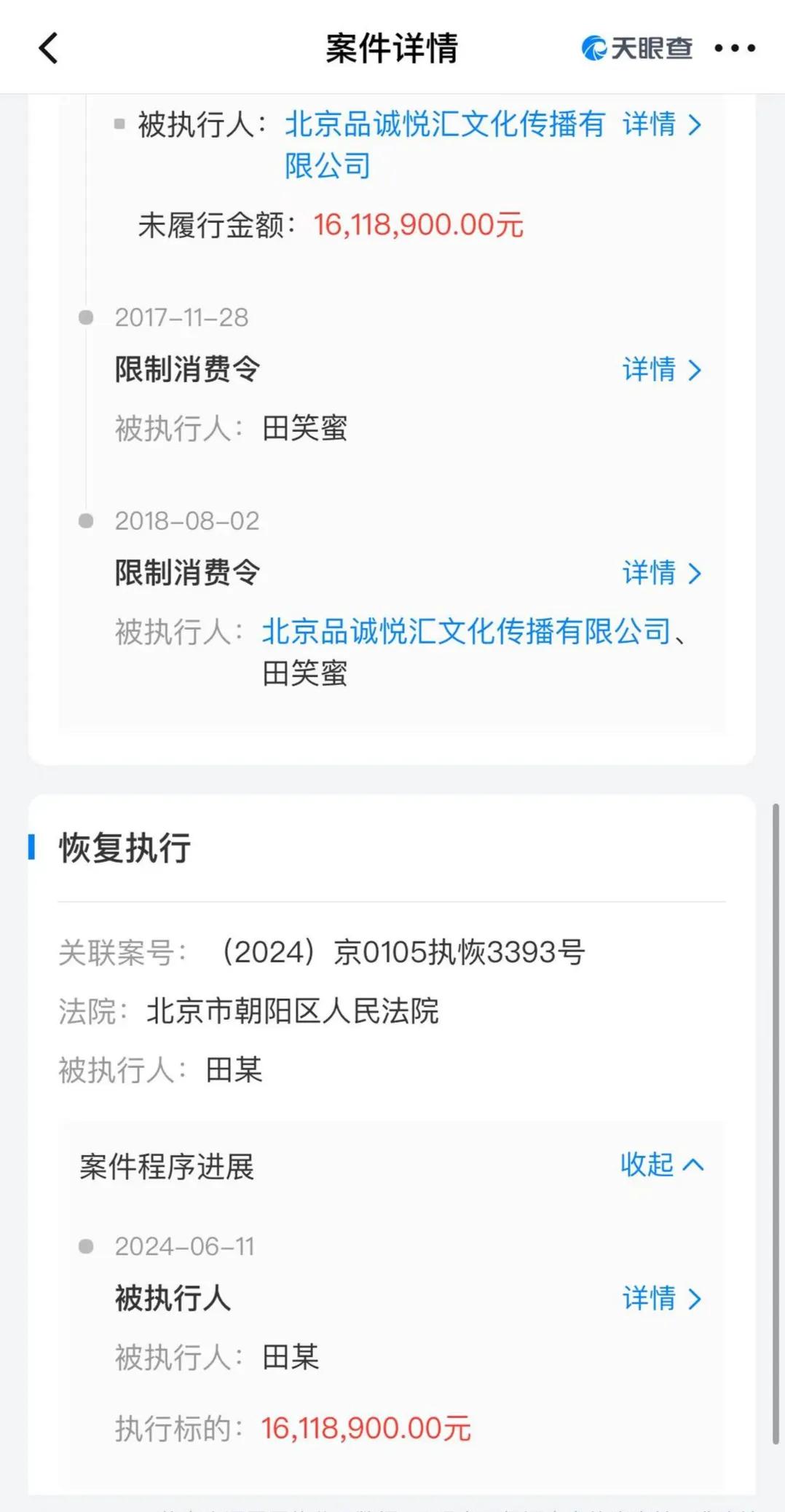 案件流程显示,2016年7月,该案件首次执行。此后,田笑蜜及其与朱丹共同经营的北京品诚悦汇文化传播有限公司被列为失信被执行人,并被限制高消费,该案也被列为终本案件。