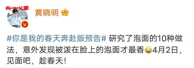 黄晓明还在个人社交平台,针对此事还表示研究了10种泡面做法,意外发现泼在自己脸上的是最香的幽默评论。