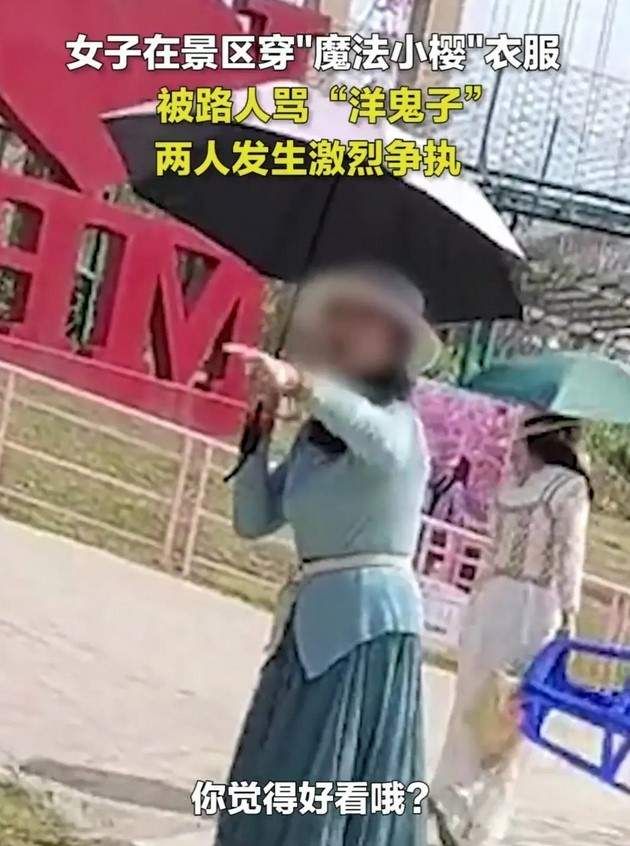 九派新闻发布的视频显示,3月1日,在成都某景区,一名女孩穿着“百变小樱”的服装,似乎是在花下拍照,而一位撑着遮阳伞路过的大妈则与女孩产生了争执。女孩情绪激动,她表示,自己穿什么与大妈没有关系,不应该被骂“洋鬼子”,甚至被说“不是中国人”。而大妈则指着女孩骂道,“你给中国人丢脸,你以为这个样子好看吗,丑死了。”对此,景区一位工作人员表示,这种情况较少,部分游客可能对这种文化不理解。