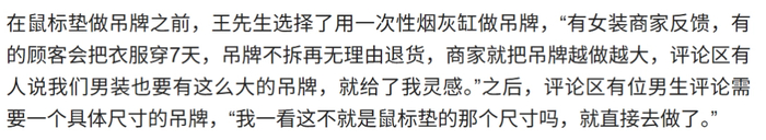 根据媒体对他的采访,他在一开始其实也打算采用“巨型吊牌”的方案,但在客户评论里看到吊牌的尺寸后,意识到了这不就是鼠标垫的尺寸,于是直接转向去做了鼠标垫。