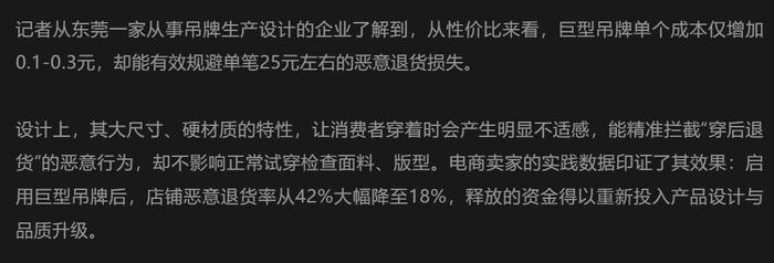 商家只需要付出几毛钱的额外成本,就能有效规避几十块的恶意退货损失。据《羊城晚报》的报道,在采用“巨型吊牌”后,一些店铺的恶意退货率从42%降到了18%,“效果拔群”。