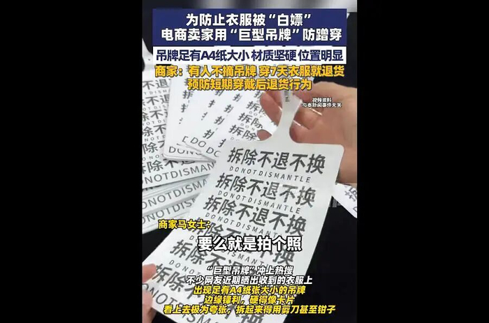 针对这种现象,前阵子开始有不少服装电商开始采用“巨型吊牌”,就是将吊牌的尺寸拉到像A4纸那么大,采用硬材质制作,用加大、加粗的字体,在吊牌上写“拆除拒绝退货”“若有污渍自负清洁费用”等字样。大尺寸影响观感,硬材质影响穿着,非要穿出门就是又不舒服又要社死,全方位针对恶意退款者的“用户体验”。