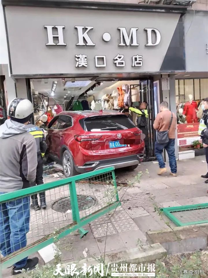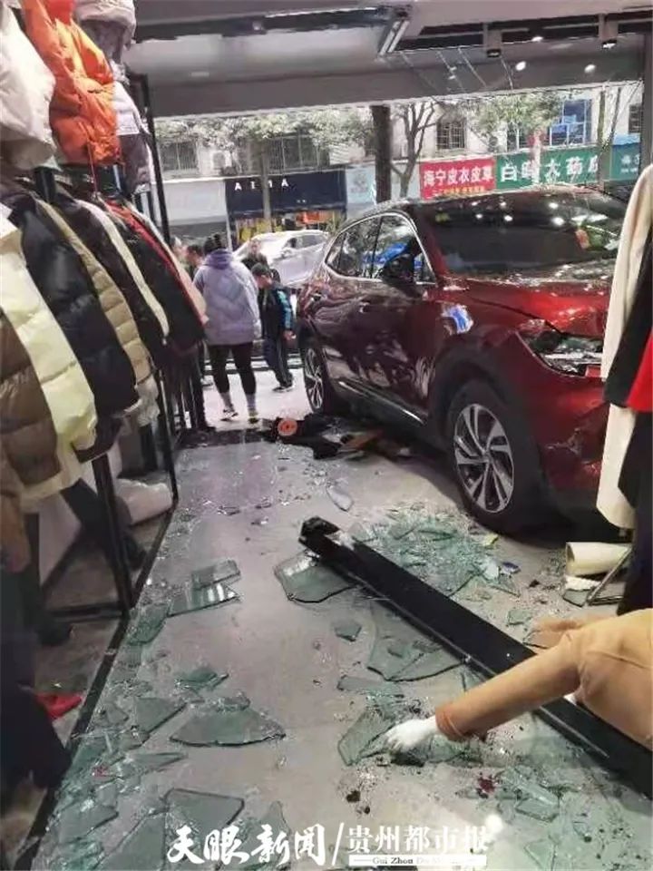 3月1日上午11时许,安顺市府路,一辆轿车突然失控,冲入人行道上服装店内,所幸未造成人员伤亡。
