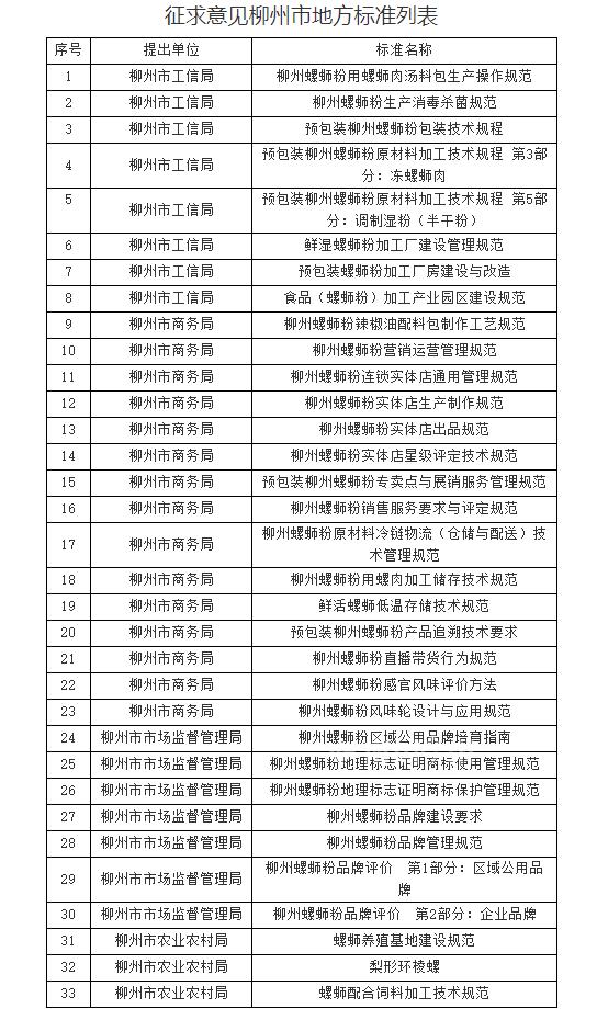 3月1日,记者看到,这些标准的征求意见稿,涉及柳州螺蛳粉螺蛳肉汤料包生产、连锁实体店通用管理规范、直播带货行为规范、区域公用品牌培育、螺蛳养殖基地建设等,分别由柳州市工信局、商务局、市场监督管理局、农业农村局等部门提出。