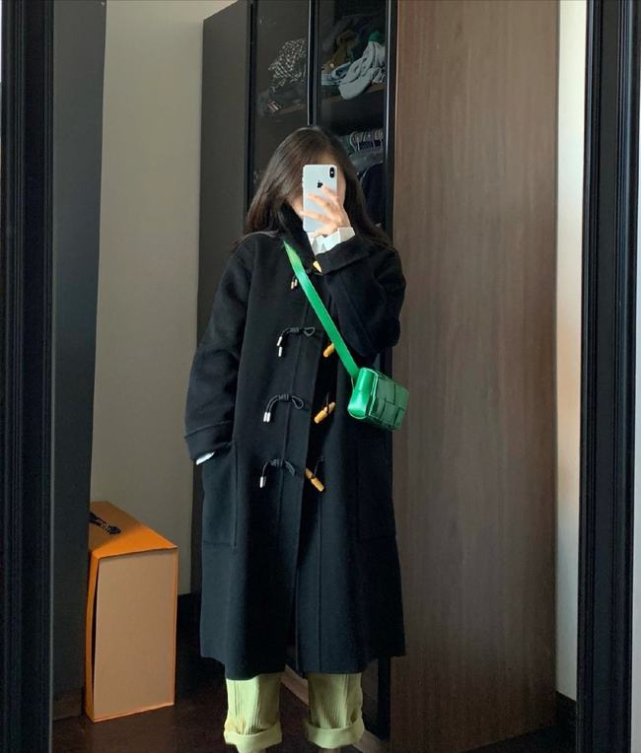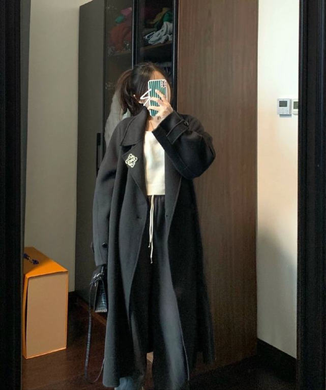 同时廓形剪裁的大衣,整体设计上比较宽松,可以打造出包裹性,所以为了让造型看上去形成很好的层次效果,内搭这一块可以选择相反的收紧处理,比如: