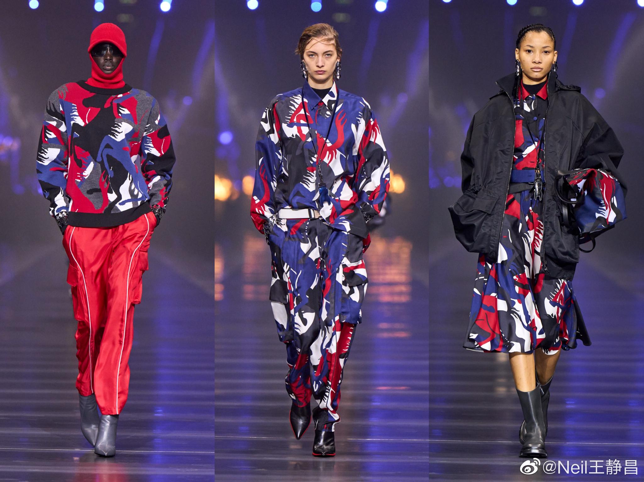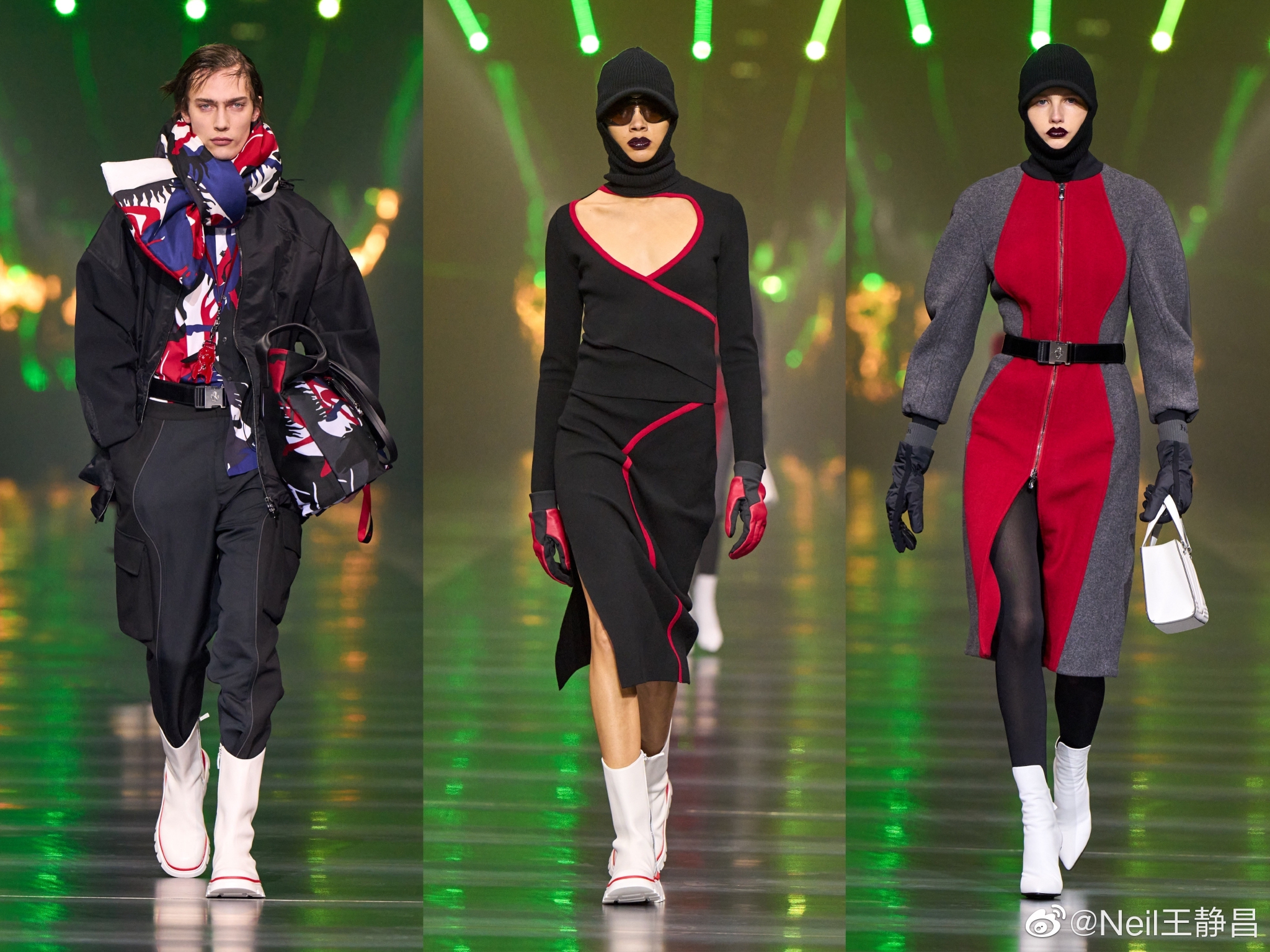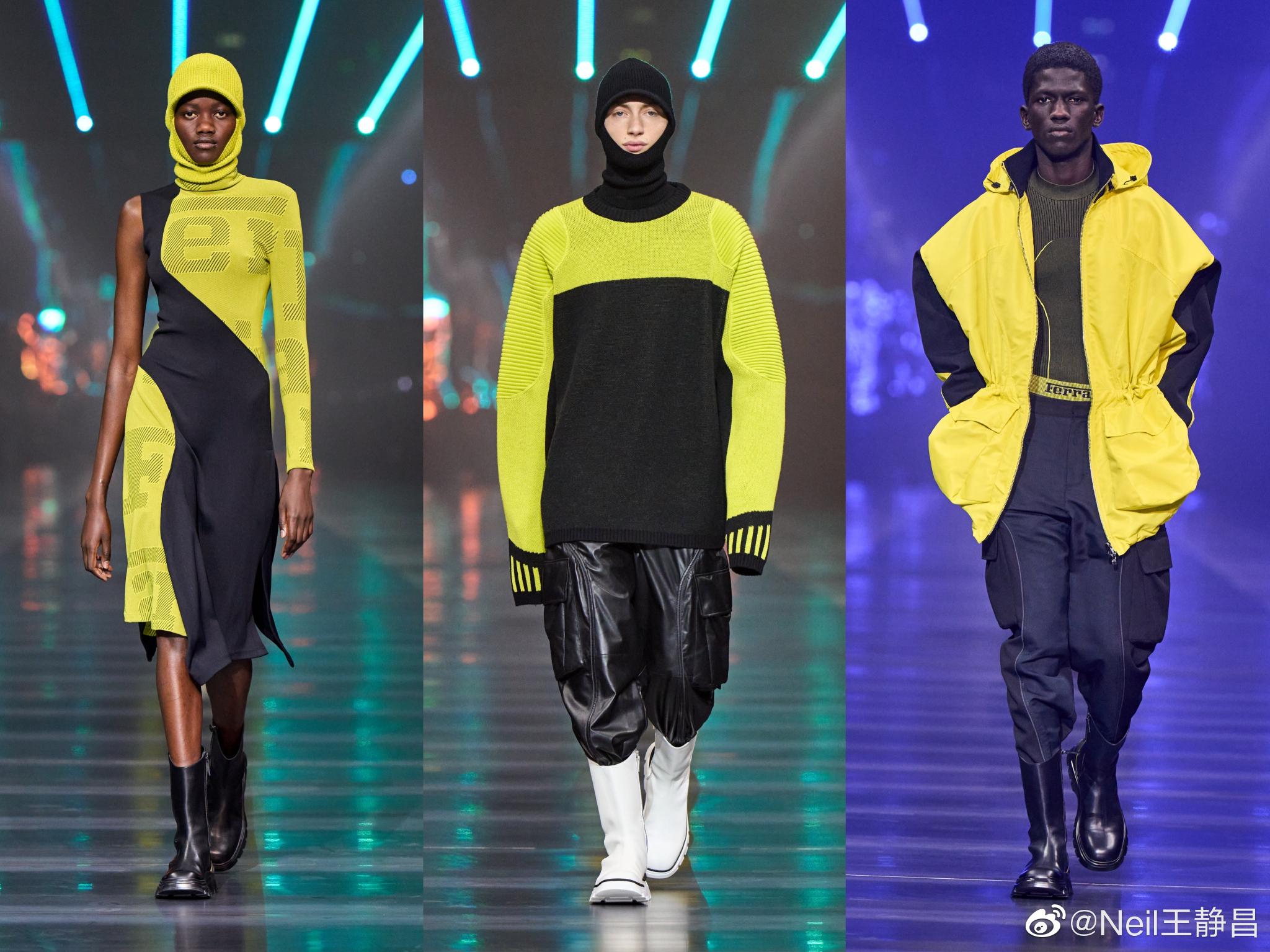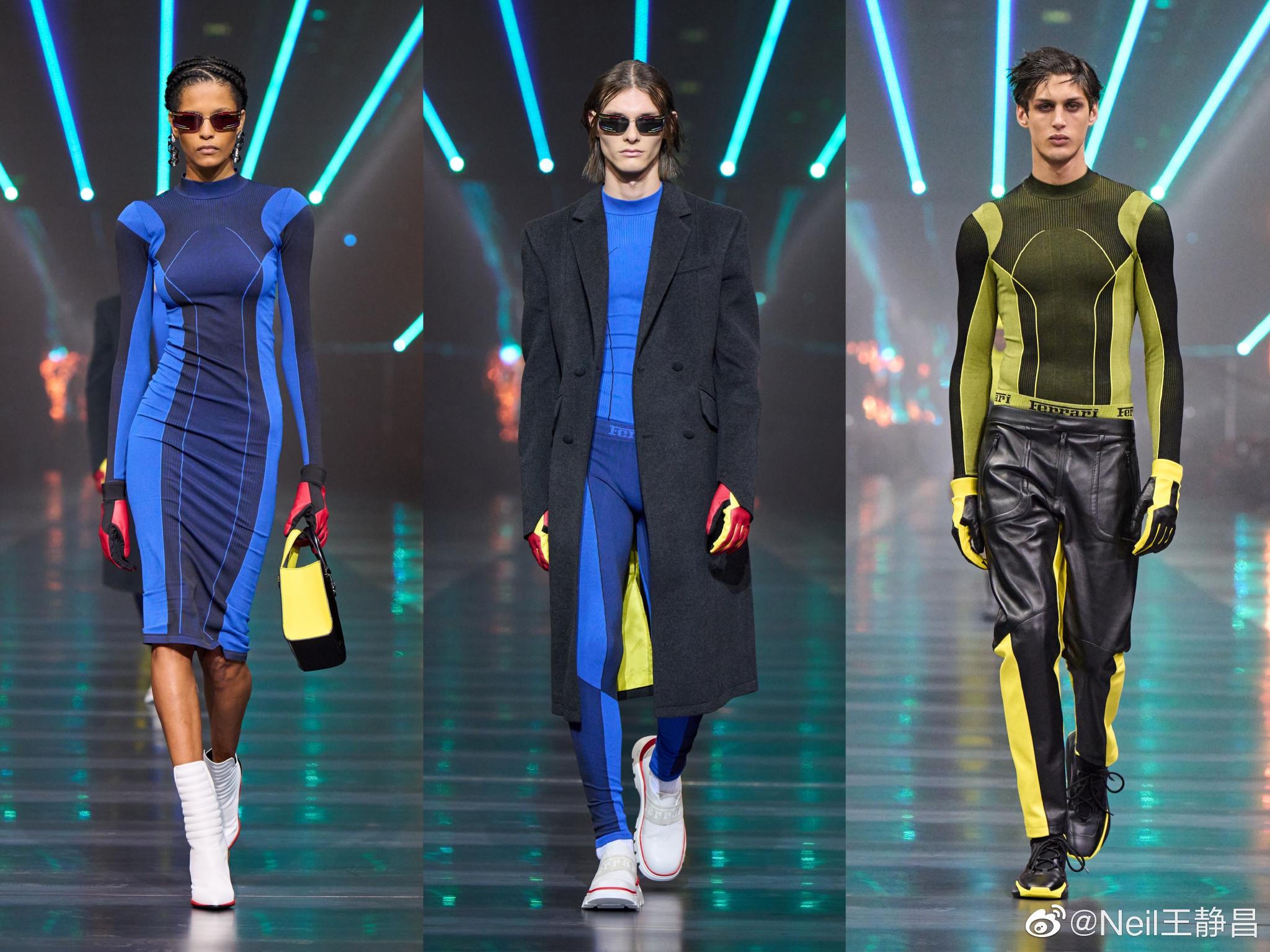 色彩上从不同调性的深色出发,逐渐过渡至亮黄色等更浅淡明艳的色调,以及引人瞩目的法拉利红与墨绿等混合色彩的搭配。因为有采用碳纤维面料及金属感材质,所以有了流光溢彩的视觉效果。
