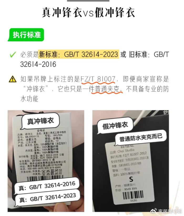 仔细看一下是否符合GB/T 32614-2016《户外运动服装 冲锋衣》。