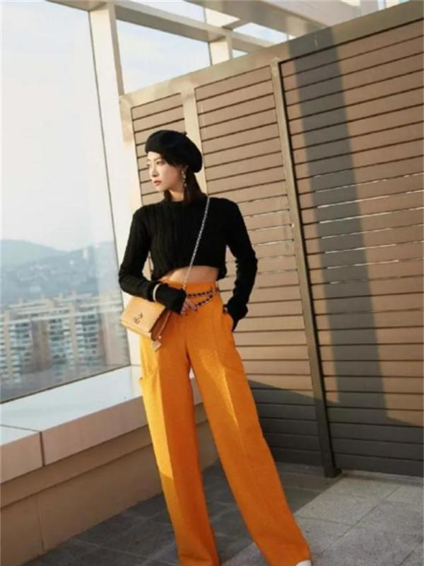 橙色拖地裤搭配黑色露脐针织短上衣,链条包也是选择了与下装颜色相近的焦糖色,搭配黑色贝雷帽,配色简约又高级,整个人名媛范儿十足。橙色这种非常有活力的颜色,上身后具有很好的减龄效果,显得整个人非常有朝气,既不会太荧光,又刚好够亮眼。很多人可能不太能接受大面积的亮颜色上身,但其实只要鲜艳的颜色数量不多,还是可以穿出高级感的。最简单的配色就是黑色和红色、酒红色,白色和蓝色、绿色,宋茜这身橙色和黑色的碰撞可以说是很有新意了,大家也可以大胆的尝试一下!