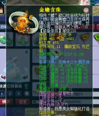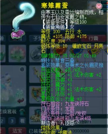 100级琴音三叠长眉灵猴女头,10锻月亮石,熔炼后防御+184,这个女头玩家没有选择简易,最主要的原因是为了搭配琴音特技,牺牲了一段月亮石。
