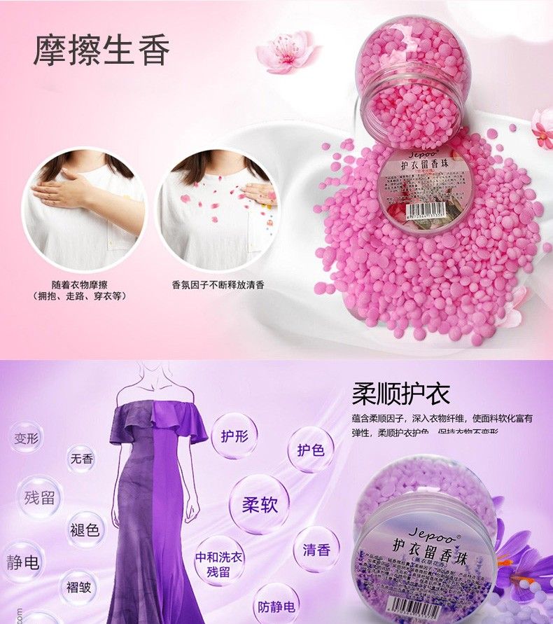 留香珠的香味有很多,大家可以根据自己的喜好选择,并且它除了可以增加衣服的香味之外,还可以起到消毒杀菌的作用,洗衣服的时候只需要将它往洗衣机里面扔几粒,就可以让一整个洗衣机衣服散发清香。