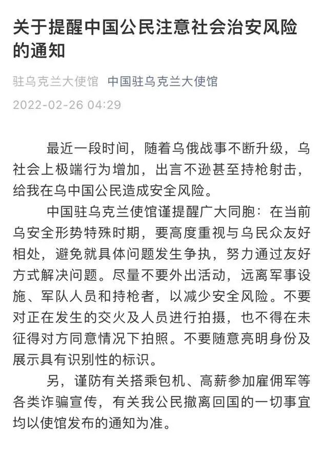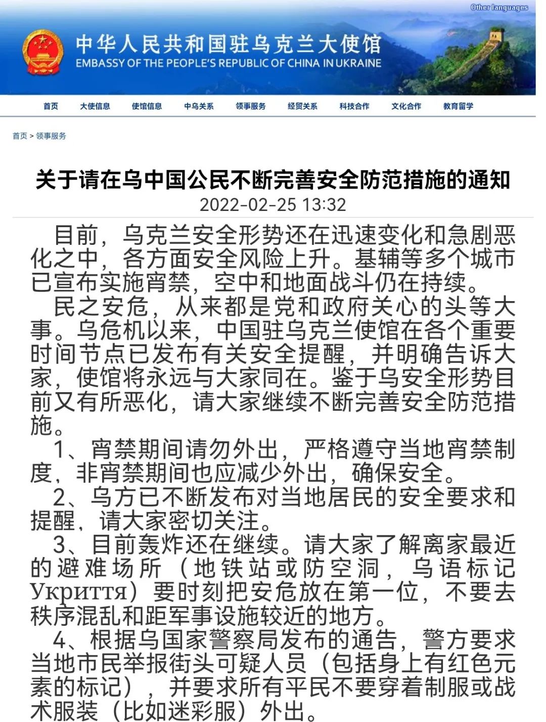 2月25日,中国驻乌克兰大使馆官网发布《关于请在乌中国公民不断完善安全防范措施的通知》,全文如下: