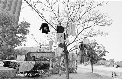 昨日,我市迎来久违的晴天,市民纷纷将洗好的衣物拿到室外晾晒。在八里湖怡景苑小区内,一些树木成了天然晾衣架,挂满各式内衣外套,树上开起了“衣服花”。有的居民在树木或灯杆间随意拉绳晾晒被单,有的索性将被单直接铺放在绿植上。如此晾晒既不文明,也影响市容市貌和小区环境。(本报记者 刘家 摄)